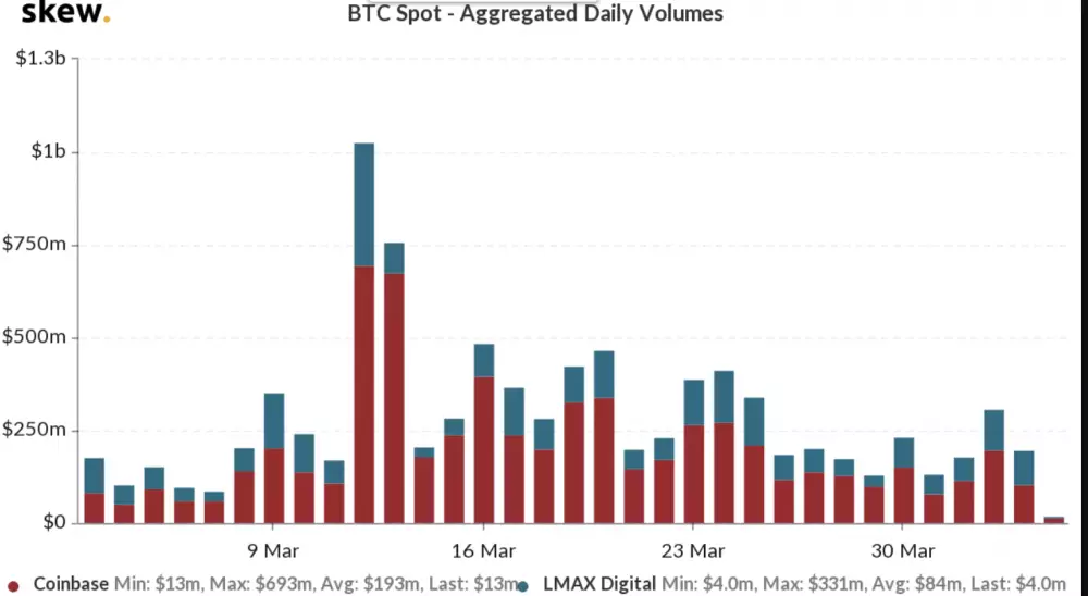 BTC objem obchodov. Zdroj: Skew