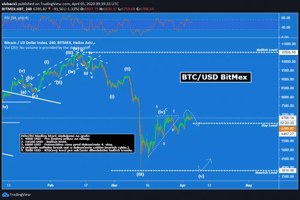 V súčasnosti cena konsoliduje na úrovni medzi 6 000 až 7 000 USD. Menšia bullish sila na trhu síce je, ale cenový retracement patrí k štandardnému vývoju na trhu. Po tak veľkom prepade z 10 000 USD sa dal očakávať retracement minimálne na 6 000 USD. Je táto hodnota konečná, alebo budeme ďalej rasť? Podľa teórie Elliot wave rast z posledných dní bola len korekčná 4. vlna a mal by nasledovať ešte jeden cenový pokles, ktorý môže byť zakončený nepochybne hlboko pod 4 000 USD.