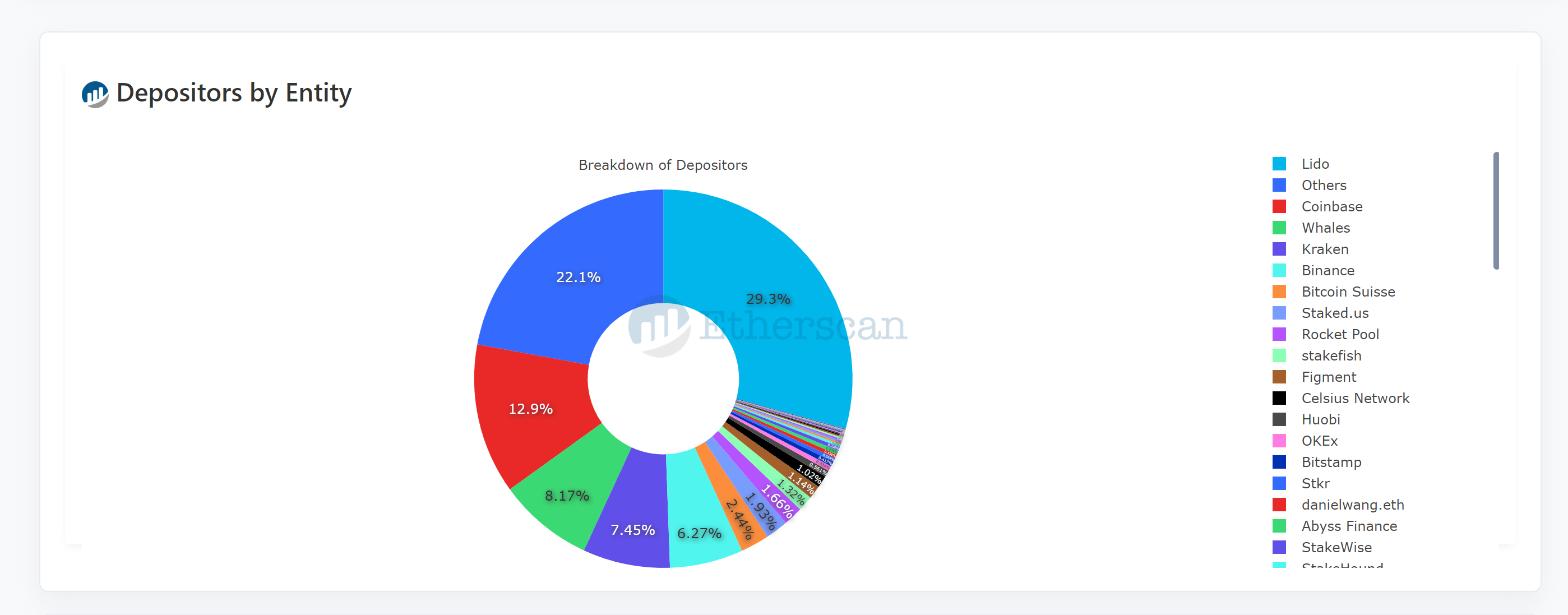Ani v prípade ethereum Proof of stake verzie sa nemôžeme baviť o úplne najvydarenejšom update. Druhá najznámejšia kryptomena sa stala výrazne centralizovanou a sieť ovládlo niekoľko entít. Ako môžeme vidieť na obrázku nižšie, až 30 % dominanciu má Lido. Nasleduje Coinbase, Kraken a Binance.