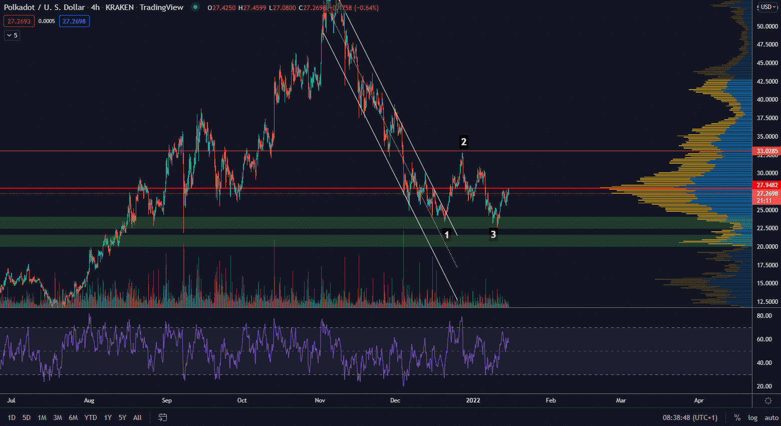 Polkadot podobne ako mnoho iných highcapov dokázal ukončiť klesajúcu vlajku a posledné obdobie smeruje skôr sideway. Táto štruktúra môže predstavovať dlhodobú reverznú zónu, no zatiaľ nebola potvrdená. Z krátkodobého hľadiska však cena pokračuje v rastúcom trende, pričom naráža na rezistenciu point of control.