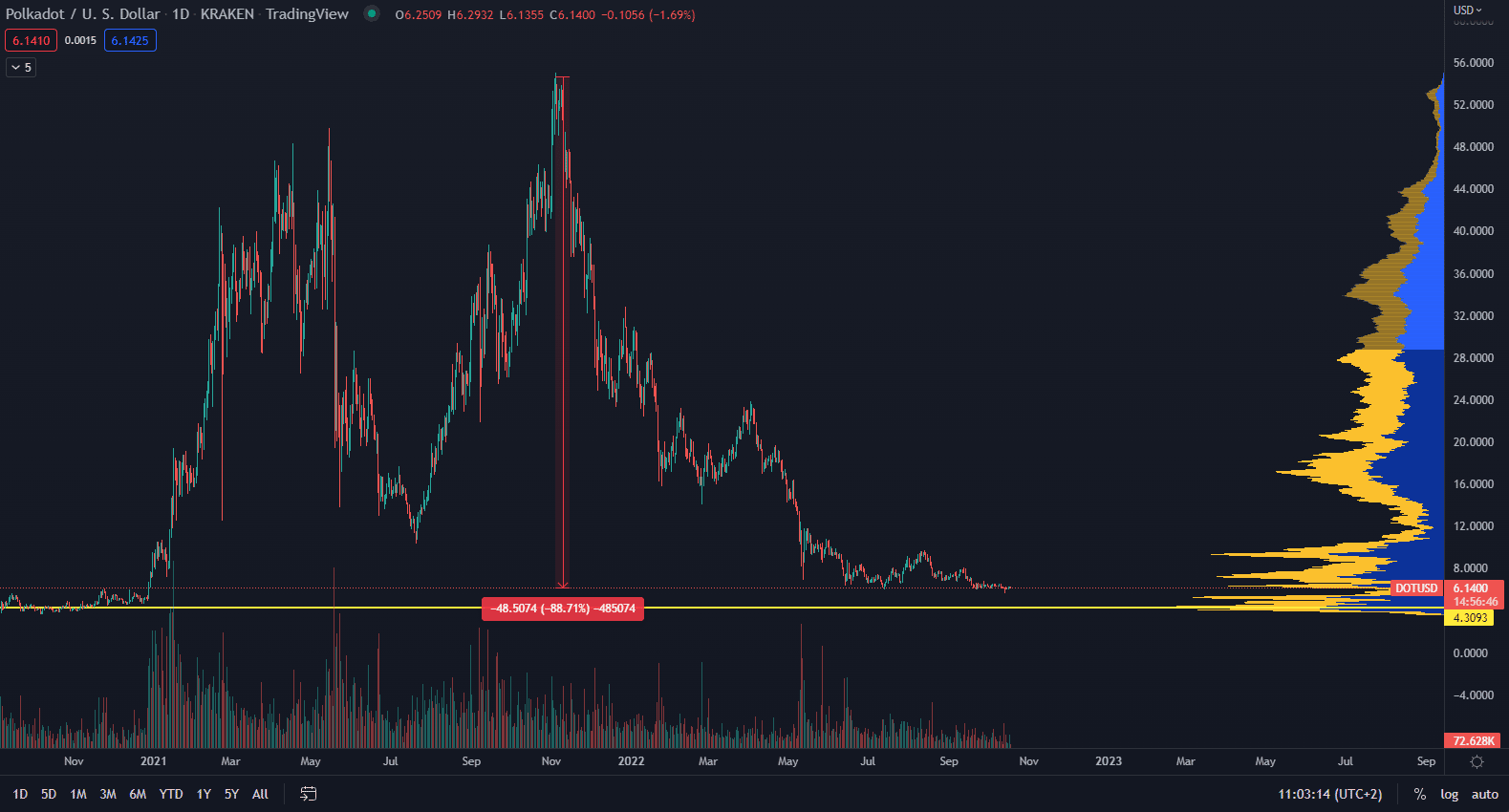 Ak prihliadneme na súčasnú vývojársku aktivitu a väčšiu korekciu v porovnaní s ostatnými vysokokapitalizovanými kryptomenami, môžeme cenu DOT považovať za podhodnotenú. V čase písania článku sa DOT obchoduje na cene 6,14 dolárov, pričom od svojho historického maxima z novembra 2021 klesol už o takmer 89 %. Naposledy sa Polkadot obchodoval za rovnakú cenovú úroveň v decembri 2020.