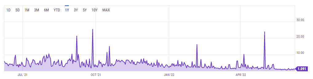 Poplatky v sieti ETH dosahujú najnižšie hodnoty za posledných 10 mesiacov. Jednoduchá transakcia teraz stojí 25 gwei v hodnote 1,17 USD a dokonca aj transakcia s vysokou prioritou stojí len 1,21 USD. Prakticky od februára 2022 poplatky neustále klesajú.