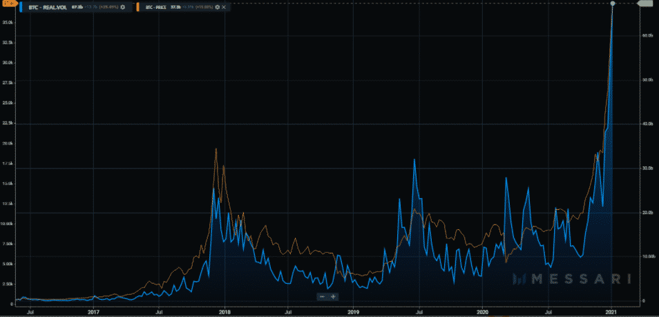 Počas 7. januára zakladateľ spoločnosti Quantum Economics Mati Greenspan zdieľal graf, ktorý ukazuje, že týždenný spotový objem prudko zdvojnásobil svoje predchádzajúce maximum, podľa Messariho metriky „skutočného objemu.” Ide o objem transakcií BTC v hodnote viac ako 60 miliárd dolárov za posledných sedem dní.