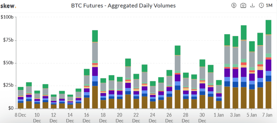 Podľa spoločnosti Skew vyprodukovali bitcoinové futures kontrakty viac ako 97 miliárd dolárov v 24-hodinovom obchode.