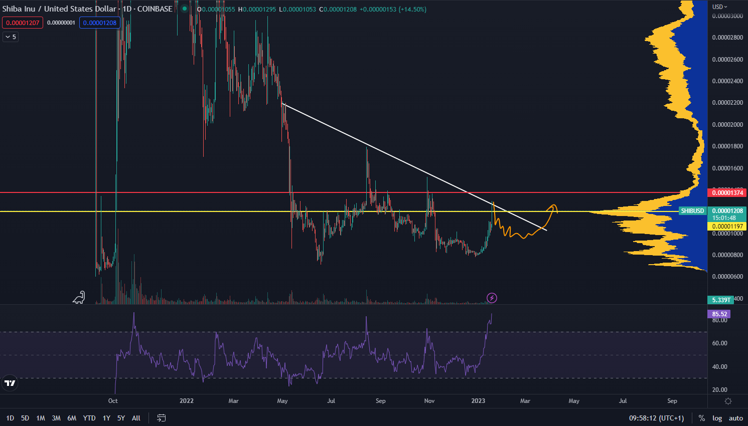 Podľa grafu z TradingView môžeme vidieť, že trhová cena sa v čase písania článku obchoduje na hodnote 0,00001208 dolára. Zároveň sa nachádza na rezistencii, ktorá pozostáva z maxím korekcie. V najbližšom období bude podstatné, aby cena sformovala vyššie lokálne minimum a v konečnom dôsledku prerazí spomínanú rezsitenciu. Cenový cieľ je na hladine približne 0,00001375 dolára.