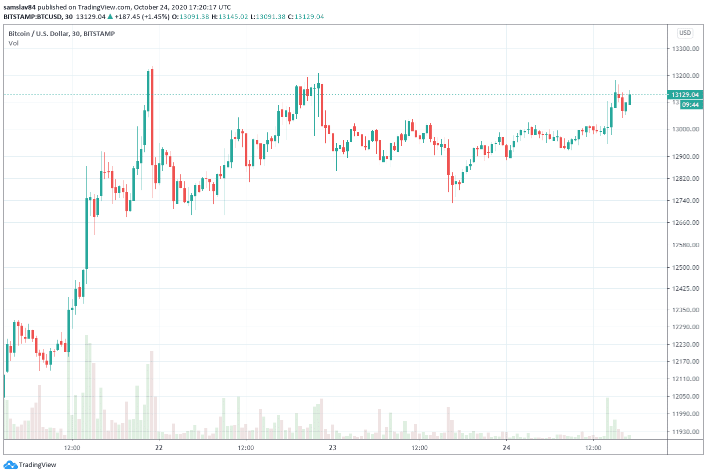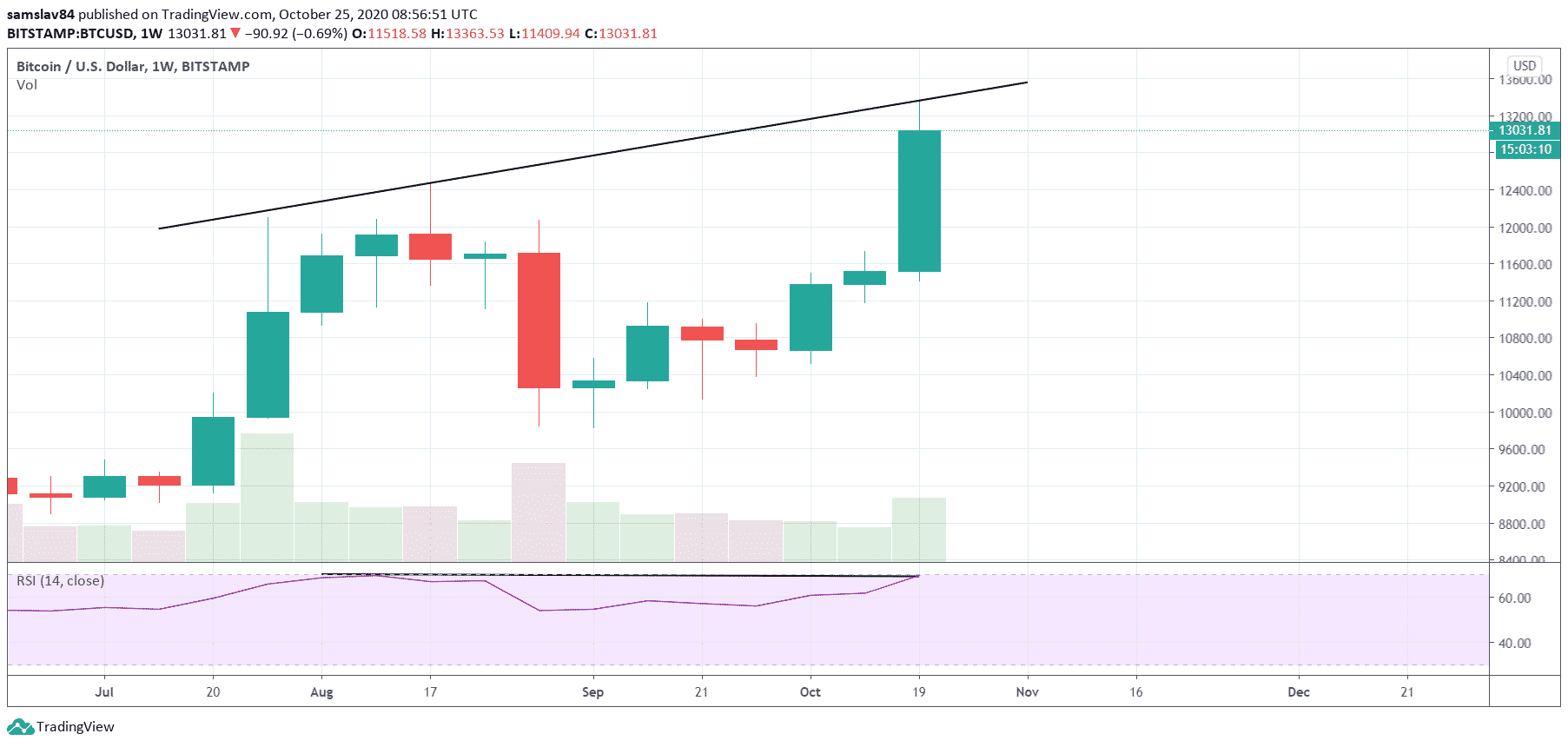 Trh s kryptomenami cez víkend opäť rastie. Po včerajšom prepade sa Bitcoin pozviechal a opäť klope na dvere hladiny 13 000 $. Za posledný týždeň je v zisku o neuveriteľných 16% a jeho graf začína nebezpečne pripomínať parabolu. Otázkou je, či sa dočkáme ešte jednej pumpy, než sa zrúti na najbližší silný support. O tom, že je októbrový rast nezdravý, svedčí aj fakt, že ďaleko prekonáva väčšinou altcoinov. Samozrejme, česť výnimkám ako Litecoin či Chainlink.