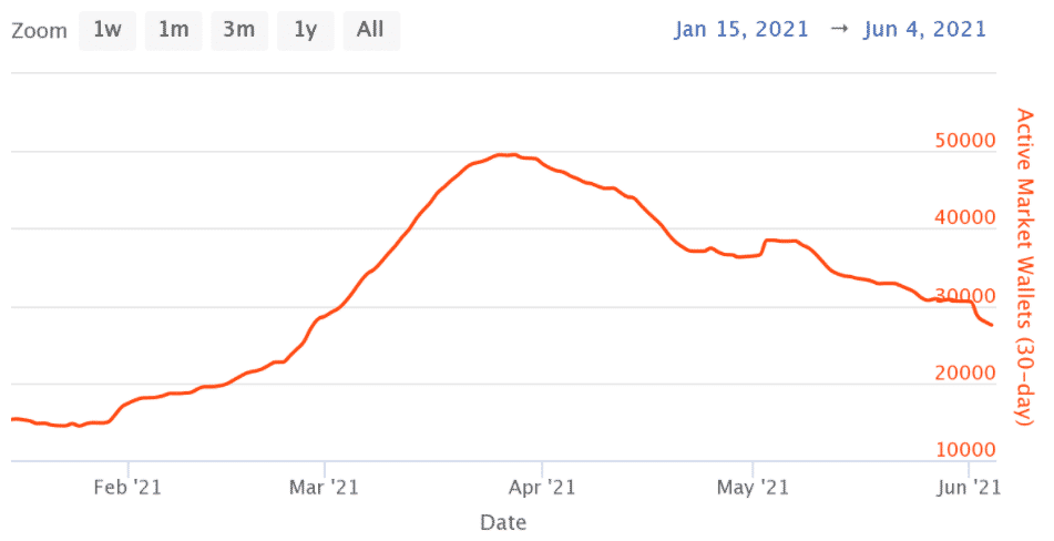 Ako je vidieť z vyššie uvedeného grafu, aktívne peňaženky na trhoch NFT dosiahli vrchol koncom marca a odvtedy poklesli o viac ako 40%. Klesajúce hodnoty v kombinácii s vysokými transakčnými poplatkami v sieti Ethereum (ETH) držali obchodníkov mimo trhu.