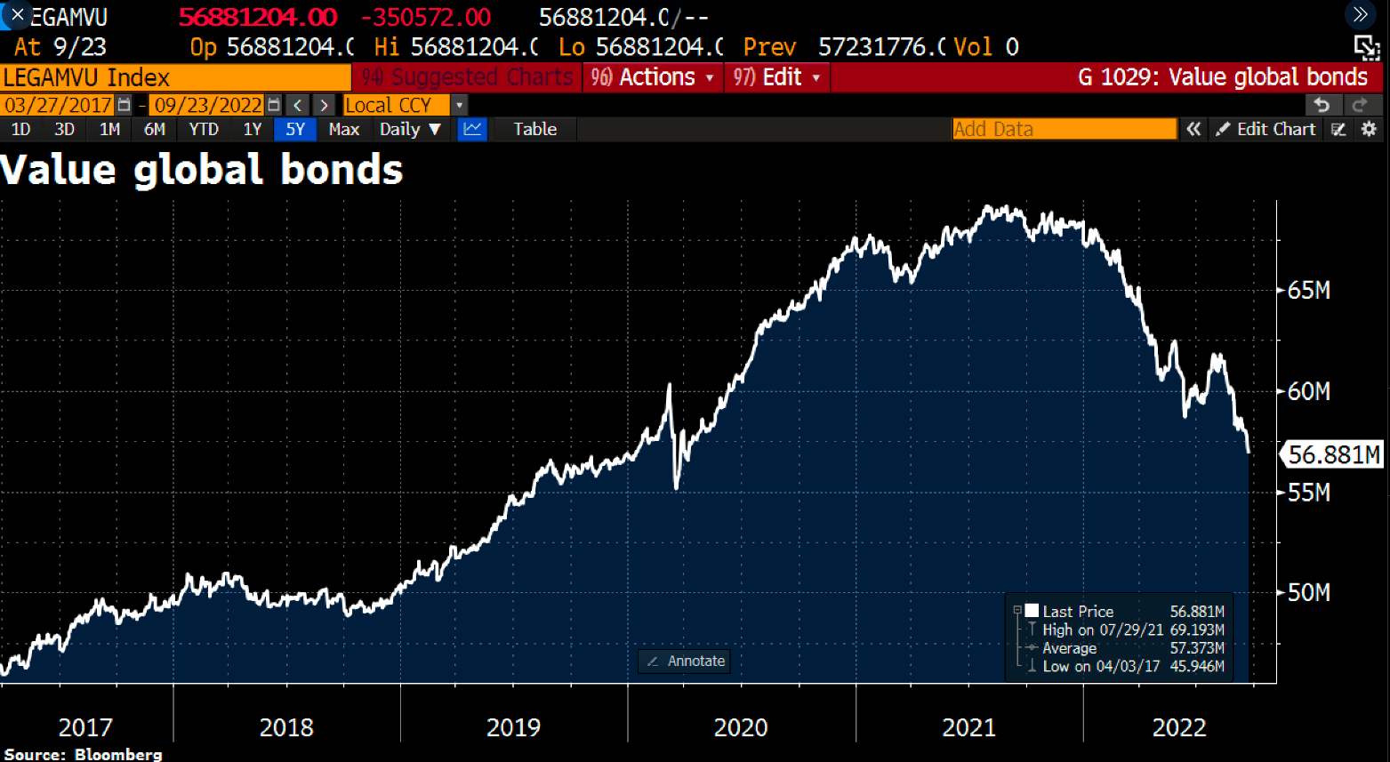 „Zdá sa, že bublina na dlhopisovom trhu praskla. Hodnota globálnych dlhopisov sa tento týždeň prepadla o ďalších 1,2 bilióna dolárov, čím sa celková strata z maxima dostala na 12,2 bilióna dolárov.”