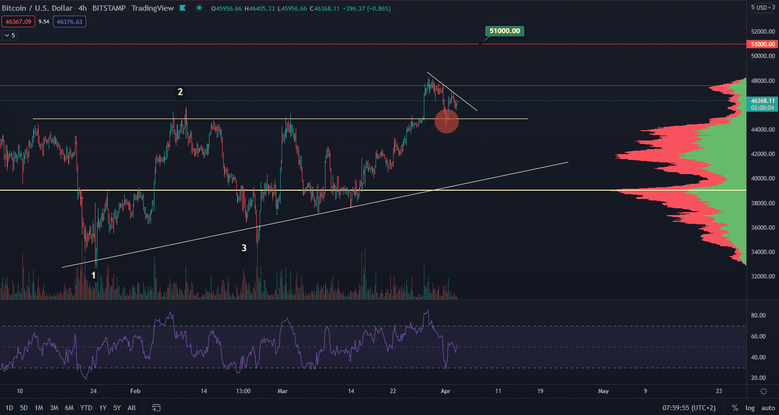 Pokiaľ je Bitcoin schopný udržať sa nad 45 000 $ v bode 2, potom je sila stále pevne v rukách býkov, čo znamená, že kryptomena bude pravdepodobne pokračovať vo svojej súčasnej vzostupnej ceste. Ak sa tak stane, potom Bitcoin môže zaznamenať veľký skok nad 50 000 $.