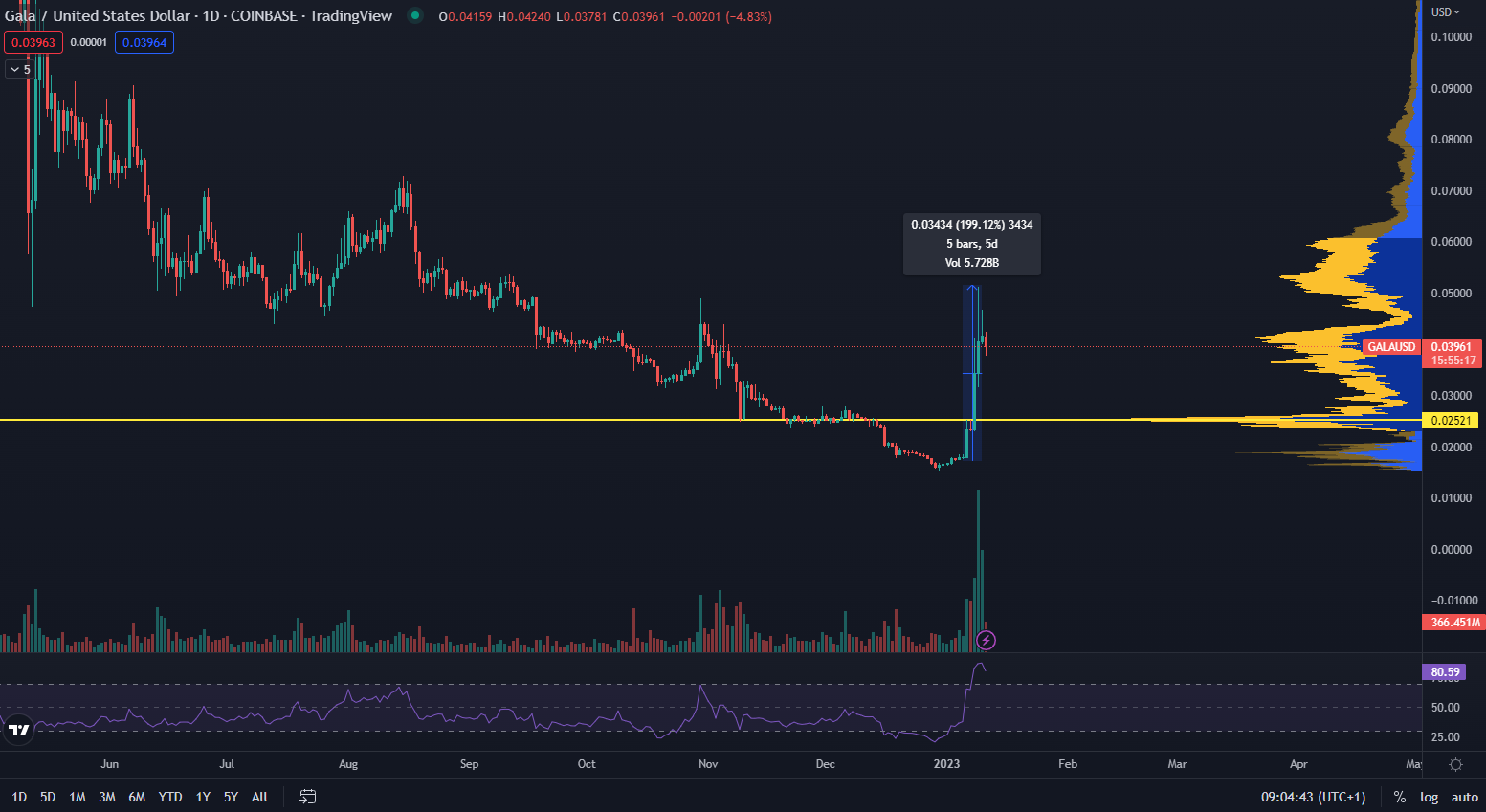 Podľa údajov z TradingView vidíme, že GALA narástla iba za 5 dní o 200 % a v najvyššom bode sa obchodovala na maxime 0,051 dolára. Cena medzitým začala klesať a potrebuje vychladnúť. RSI taktiež indikuje prehriaty trend, ktorý musí nabrať novú silu. Otázkou zostáva, či je súčasný vzostup udržateľný aj na dlhšie obdobie.