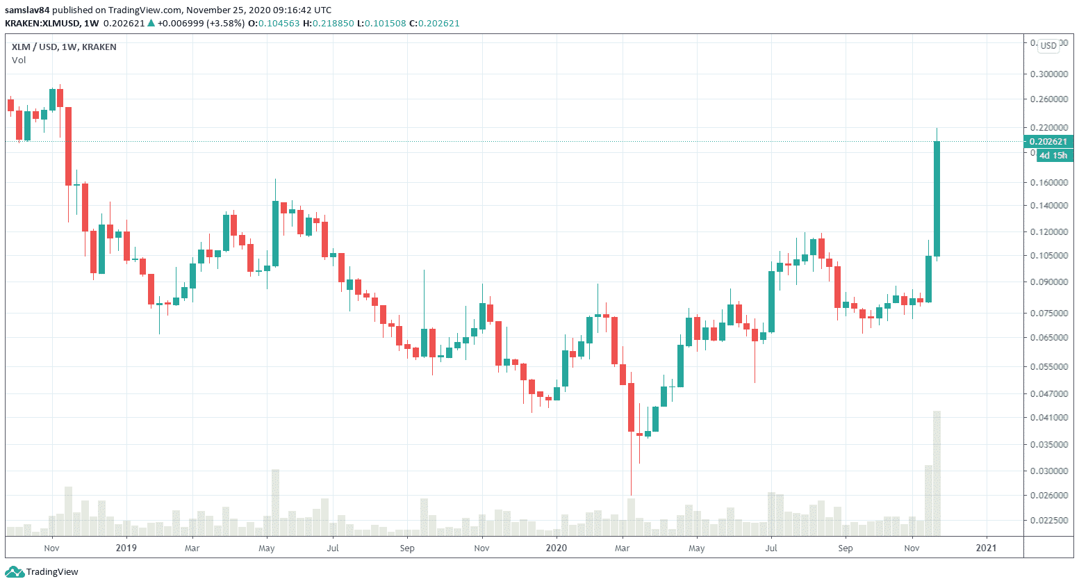 XLM včera prekonal cenu 20 centov. Tak vysoko bol naposledy v novembri 2018. Komunita má teda dôvod na oslavy. Ľudia, ktorí v posledných rokoch vytrvalo nakupovali, teraz konečne dostali odmenu za svoju vytrvalosť. Len je otázne, ako dlho to ešte vydrží.