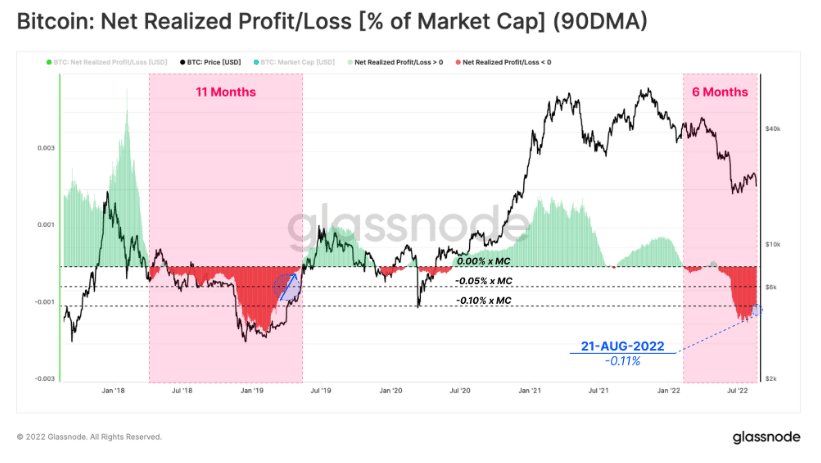 Podľa grafu vyššie môžeme vidieť, že realizované straty ustupujú a predávajúci začínajú byť unavení. Stále sme však ďaleko od reverzie trendu a metrika je hlboko pod nulou. Ak však bude tento trend pokračovať, do pár mesiacov sa na trhu pravdepodobne budú realizovať zisky. Dovtedy však spotová cena BTC môže pokračovať v korekcii.