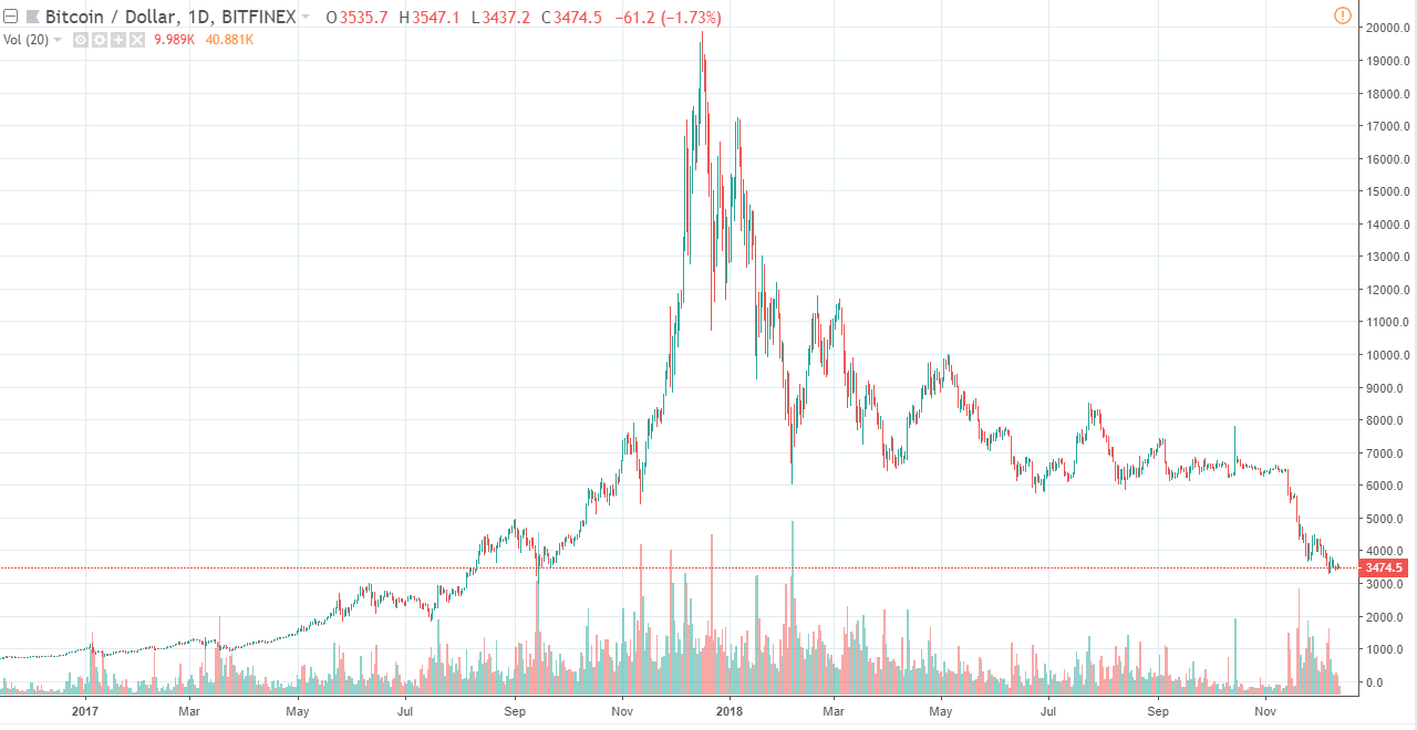 Momentálne sa nachádzame v jednej z najhorších fáz každej bubliny – despair (beznádej). Nasledovať bude kapitulácia – fáza, počas ktorej narastie volume, cena klesne na totálne dno, každý bude hovoriť o tom, ako je koniec, a nech posledný, kto pôjde preč, zhasne… a potom sa vrátime k dlhodobého trendu (ktorý sa počas desiatich rokov fungovania Bitcoinu nezmenil).