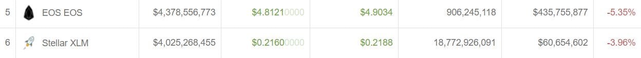 Piate a šieste miesto v rebríčku kryptomien zoradených podľa kapitalizácie držia technologické coiny EOS a Stellar. Rozdiel kapitalizácií týchto dvoch coinov sa za posledné dni zmenšil z miliardy na „iba“ 250 miliónov. Oba Altcoiny síce klesajú, no zatiaľ čo EOS za posledný deň stratil takmer 5,5% hodnoty, Stellar iba 4%. Ak tento trend bude pokračovať, čoskoro by sa „raketka“ mohla prebojovať do TOP5.