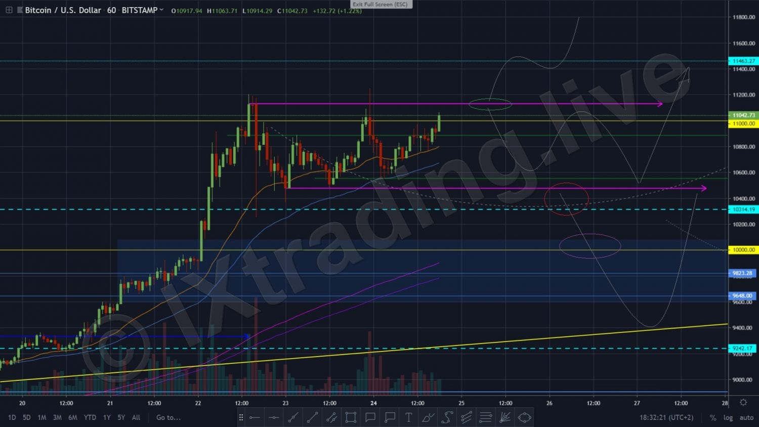 Dnes použijem graf od IXOYE z Trading11 (celá analýza tu), kde môžeme vidieť vymedzené niektoré reakčné hladiny a najpravdepodobnejšie scenáre pre BTC.