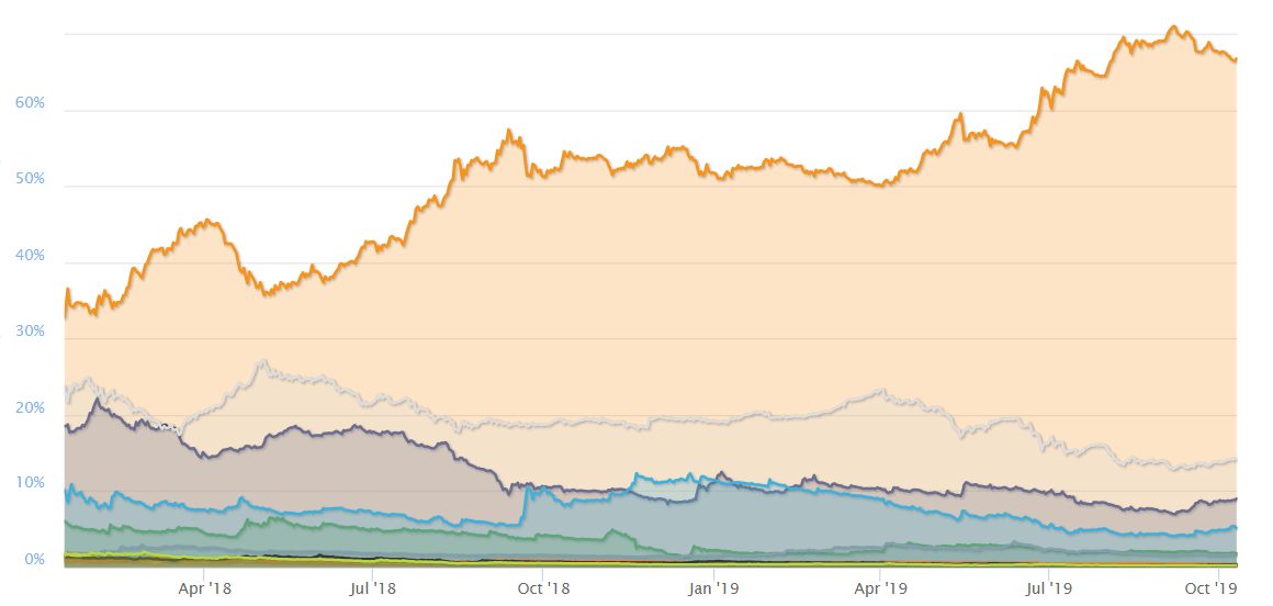 Tá sa momentálne pohybuje okolo 67 % – o trochu menej než rekordných 71 %. Bitcoin je na tom momentálne celkom dobre. Už sa stihol vyhrabať z októbrového dna a momentálne útočí na veľmi silnú rezistenciu.