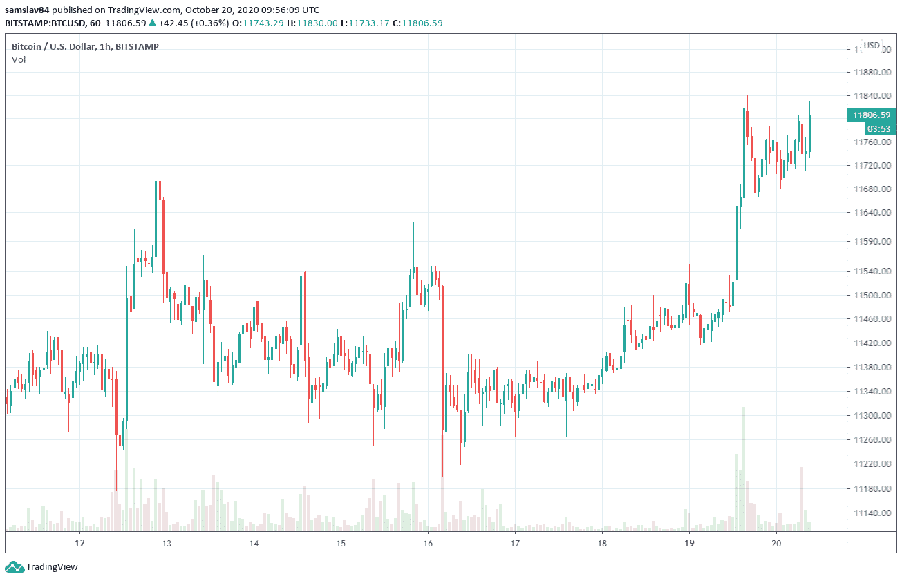 Pokus o prerazenie ďalšej rezistencie prebieha aj v tejto chvíli. Po 14-dňovej konsolidácii v intervale 11 200 – 11 500 USD včera ráno konečne prerazil a dnes sa tlak naďalej zvyšuje. Nové high smer zaznamenali na hladine 11 870 $ (burza Bitstamp).
