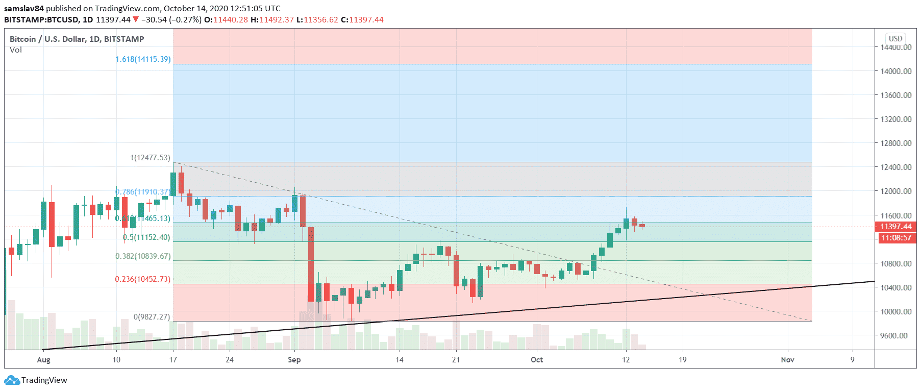 Fibonacciho indikátor nám dáva základné technické hladiny, ktoré môžu Bitcoinu poskytnúť podporu alebo rezistenciu. Fibo hladiny sme dostali natiahnutím indikátora augustového maxima 12 477 $ ku dnu na 9827 $. V súčasnosti sa nachádzame v UPtrende,takže môžeme počítať s plným zotavením Bitcoinu z tohto prepadu. Aktuálne sa nachádza blízko hladinu 0,618 (zn. po septembrovom prepade už získal späť viac než 60% hodnoty). Nad nami sa na cene 11 900 $ ešte nachádza hladina 0,782.