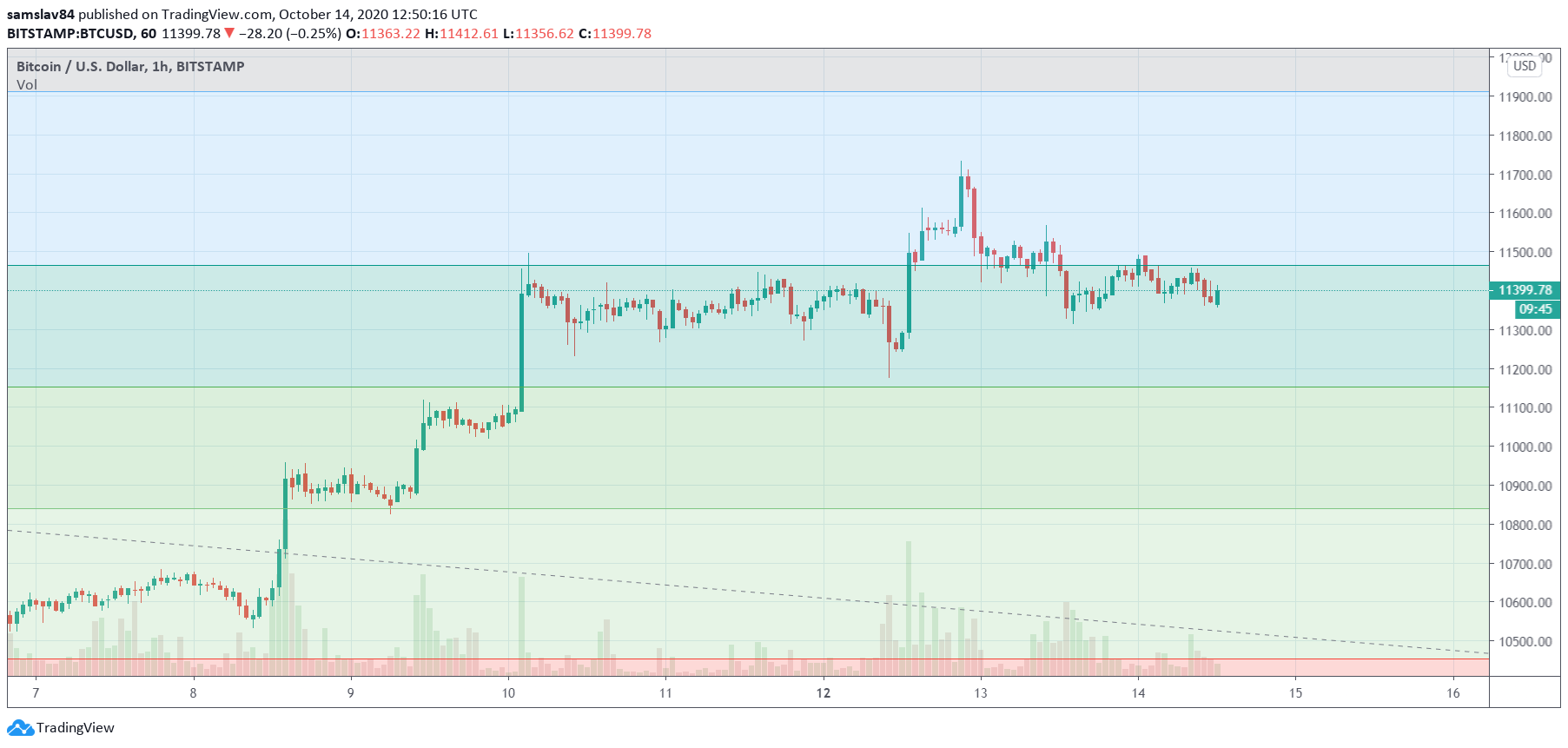 Po prelomení kľúčového rezistenčného pásma 10 800 – 11 400 $ Bitcoin akumuluje kapitál. V pondelok sa síce pokúsil o ďalší prieraz, no veľmi rýchlo sa stiahol späť. Aktuálne lokálne maximum tak ostáva na 11 750 $.