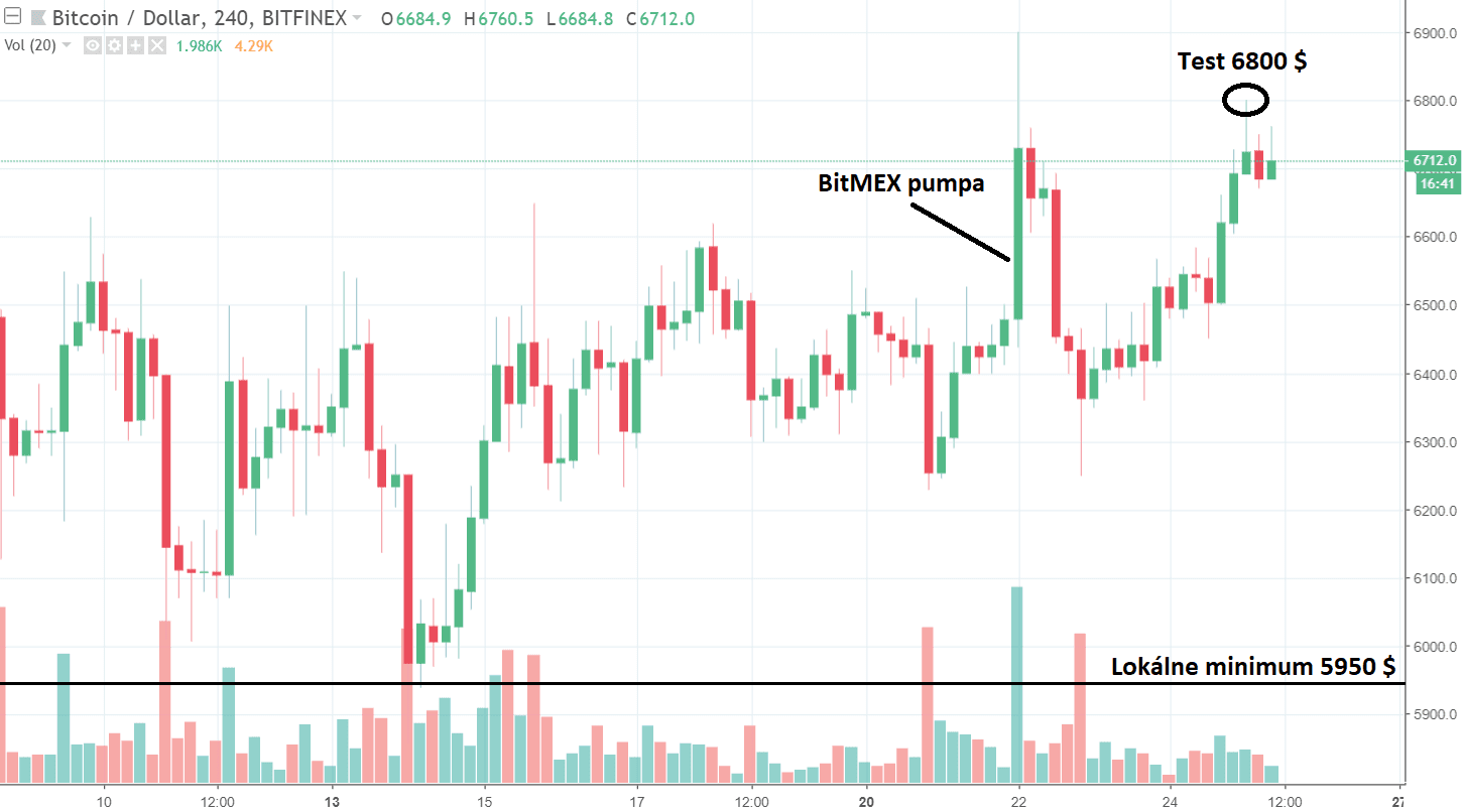Tlak predávajúcich však očividne nestačí, pretože Bitcoin sa aj napriek veľkému negatívnemu sentimentu dostal z „nudného pásma“ (6000 – 6500 $) a konsoliduje tesne nad ním. V čase písania tohto článku sa pohybujeme nad hladinou 6700 $. Pod nami je v intervale 6500 – 6600 $ silný support, nad nami na hladine 6800 $ rezistencia. Tú sme už dnes o polnoci otestovali. Zatiaľ drží.