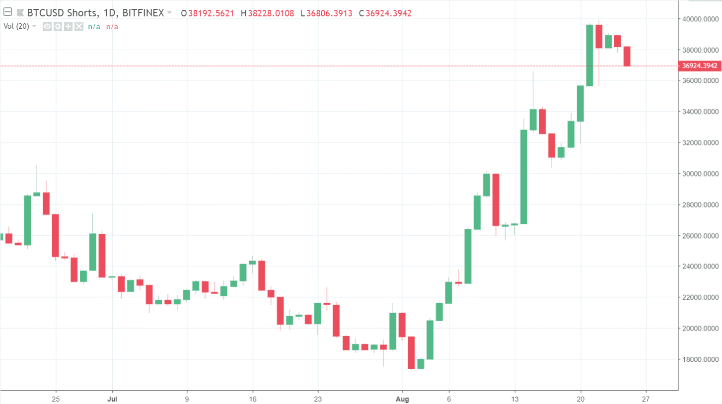 Vďaka konsolidácii Bitcoinu v „nudnom pásme“ sa nám pomaličky začína pretáčať daily downtrend na uptrend. To je zlá správa pre rekordné množstvo shortárov, ktorí ešte stále veria v pokles. Zatvorenie shortu sprevádza nákup daného počtu Bitcoinov a objem shortov za posledné dva dni skutočne klesol. Približne o 3000 BTC.