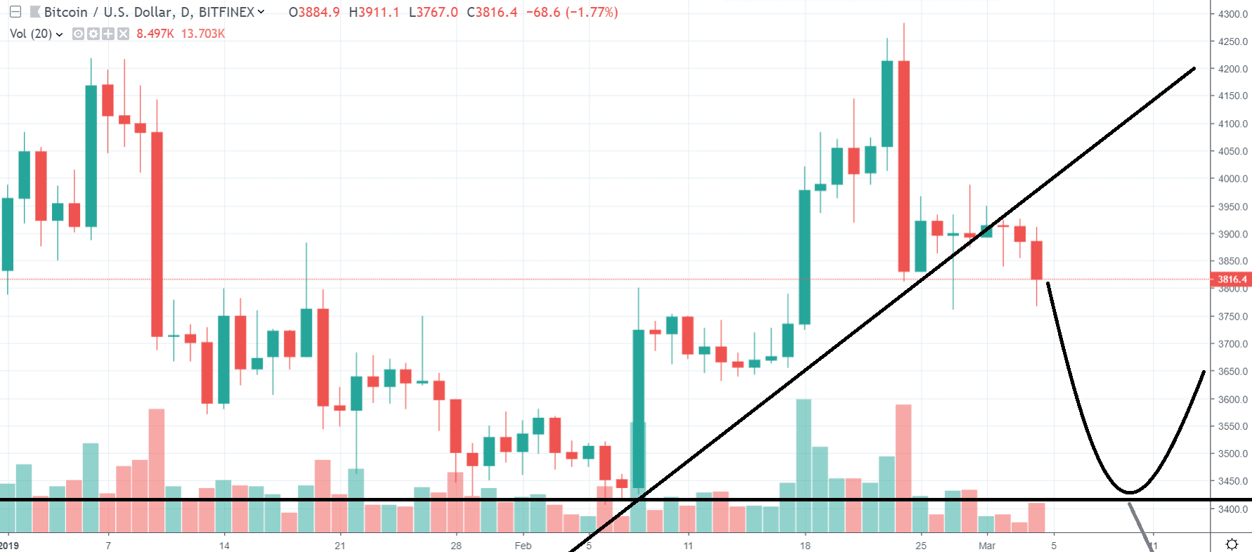 Pri pohľade na graf BTC/USD Bitcoin od začiatku nového roka konsoliduje v relatívne úzkom kanále medzi 3500 – 4300 $. Týmito dvoma hladinami je ohraničený a pokiaľ neprerazí na jednu alebo druhú stranu, nič zaujímavé sa diať nebude.