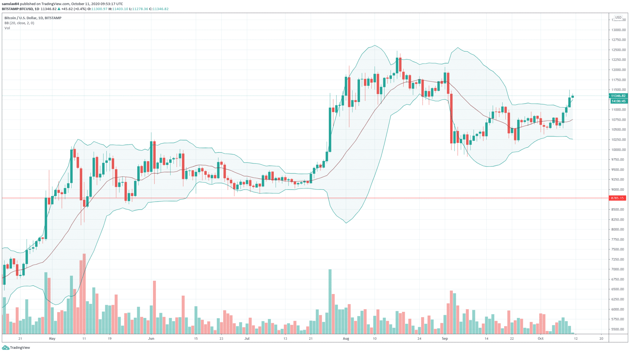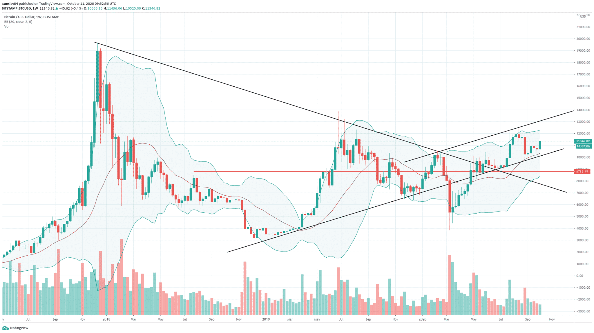 BTC sme naposledy na týchto hodnotách videli na začiatku septembra pred dumpom, ktorý nás poslal do konsolidačnej zóny 10-11 tisíc. Za posledných päť týždňov sa trh niekoľkokrát neúspešne pokúšal o prerazenie tohto intervalu. Bitcoin ho nakoniec prerazil pri relatívne nízkom volume a oči traderov sa teraz upierajú na weekly sviecu. Kľúčové bude uzatvorenie týždňa nad 11 000 $ a ešte lepšie by bolo prerazenie 11 400 $. Potom už nič nebude brániť v raste na minimálne 12 000 $, prípadne aj na nové tohtoročné high.