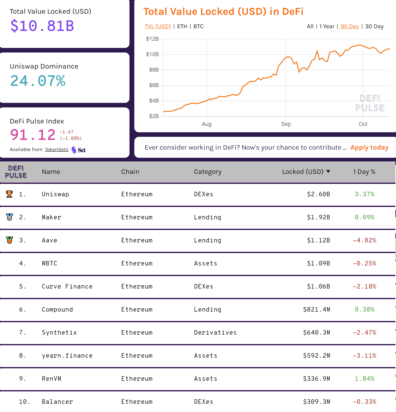 Objem peňazí uzamknutý z DeFi smart kontraktoch taktiež mierne stúpa a pohybuje sa tesne pod 11 miliardami dolárov. Na prvom mieste je s 2,6 miliardami stále burza Uniswap. Druhé miesto okupuje Maker s takmer dvoma miliardami a lending platforma Aave si drží tretiu priečku. Doťahuje sa však na ňu projekt WBTC – ktorý prináša ekvivalent Bitcoinu na Ethereum blockchain.