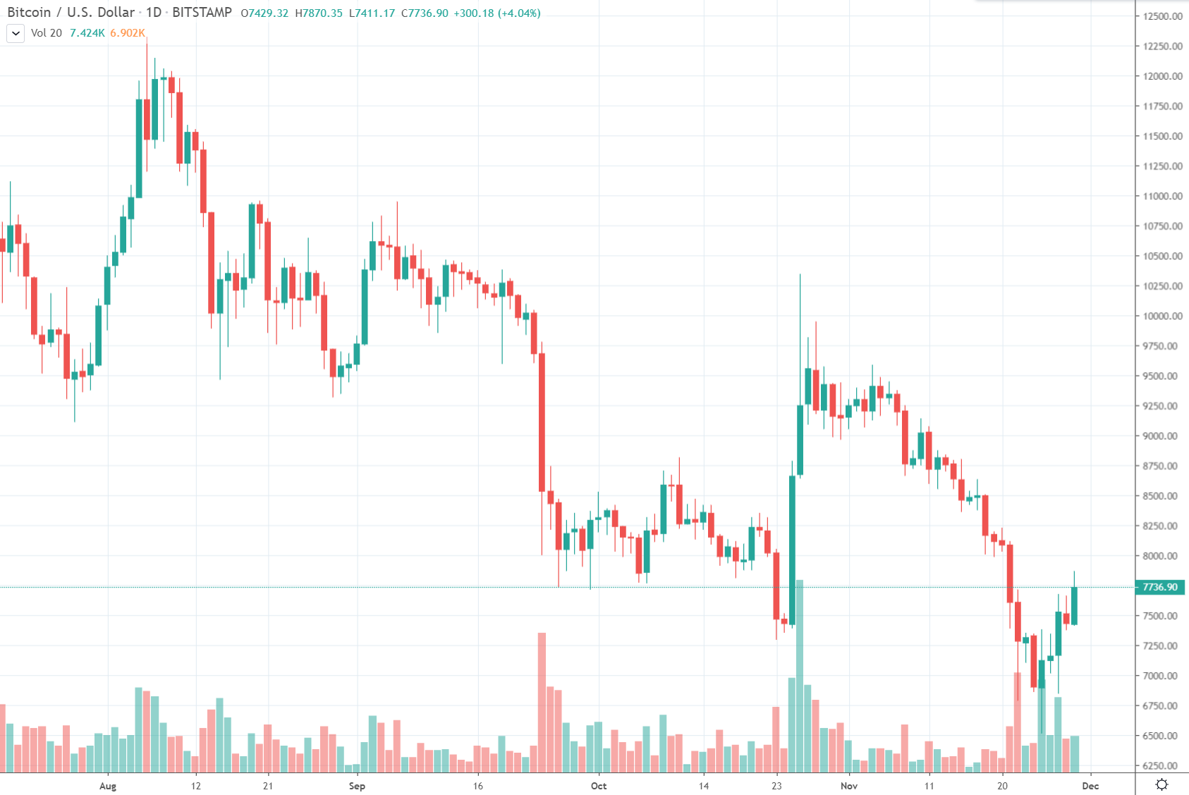 Bitcoin tento týždeň po pondelkovom flash crashi pokračuje v korekcii negatívneho pohybu z minulého týždňa. Najprv prerazil rezistenciu na hladine 7400 $ a aktuálne sa už traduje za 7750 $. Býci pomaly posúvajú cenu hore a dá sa povedať, že tento pohyb je viac menej organický.