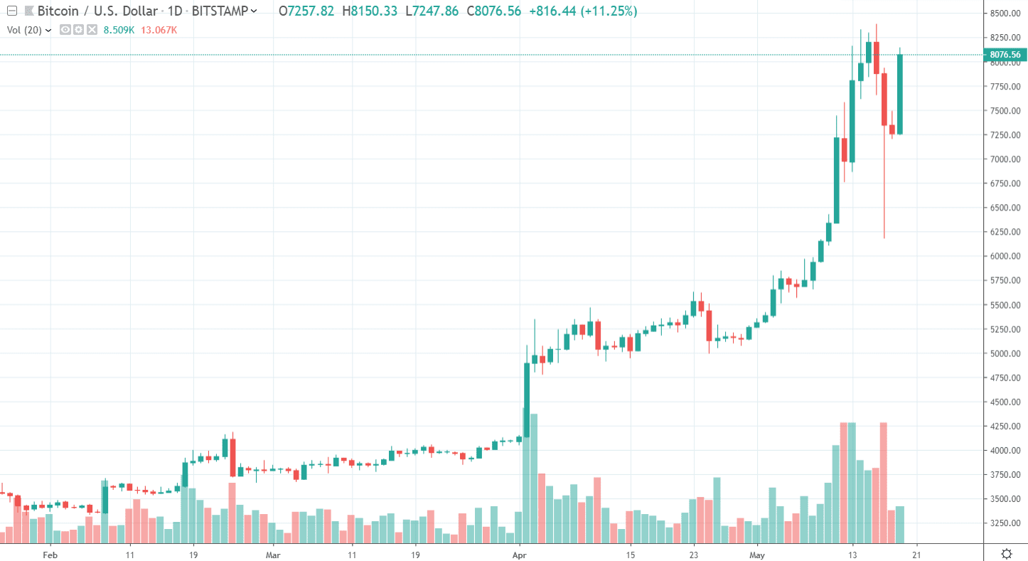 AAAAAA čo sa to deje? Veľa ľudí tvrdilo, že po piatkovom dumpe sa tak skoro ďalšieho rastu nedočkáme. Ale je to tu! Bitcoin tvrdohlavo stúpa hore a v posledných hodinách už zase prekonal hladinu 8000 $. Na burze Bitstamp viac menej testuje tohtoročné high. Znamená to teda, že všetko zlé je za nami a môžeme pokračovať smerom k 10 000 $?