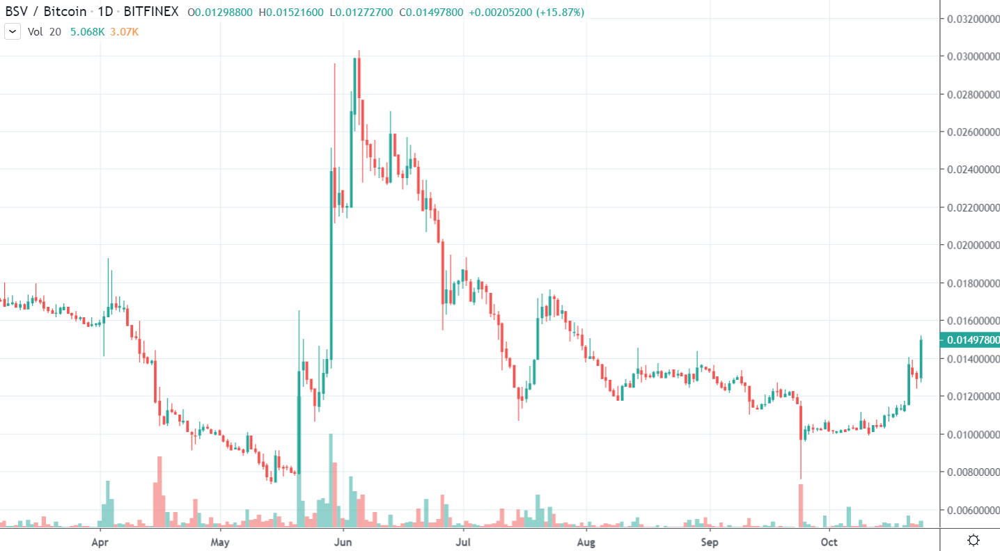 To však neplatí pre Bitcoin SV: Tento kontroverzný coin skáče hore a dole. Deň pred včerajším dumpom sa rozbehol hore a zaznamenal 10 % rast. Ten sa síce včera zmazal, no dnes tu máme ďalšiu, tentoraz 12 % pumpu. Bitcoin SV sa tak stal jedným z mála altcoinov, ktoré včerajší dump príliš neovplyvnil.