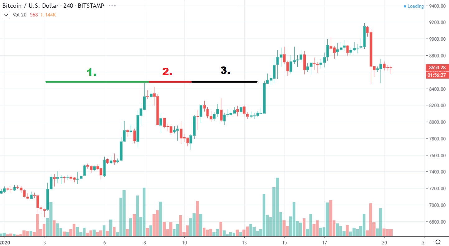 Vo všeobecnosti platí, že aby bol rast zdravý, Bitcoin by mal prejsť všetkými troma periódami. Vo fáze rastu prekoná rezistenciu, následne ju korekciou otestuje (tým sa doplnia objednávky do orderbookov na burzách) a z rezistencie sa stane support. V následnom tichšom období (konsolidácia) sa Bitcoin pripraví na ďalší rast.