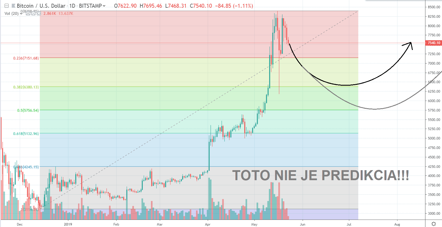 Na graf som natiahol Fibonacciho indikátor. Rád by som poukázal na to, že 30-40 % korekcia Bitocinu pekne koreluje s 38,4 – 50 % korekciou celkového rastu od tohtoročného low až po high. Verím, že Bitcoin má dobrú šancu udržať sa nad 5000 $ a už nikdy neklesnúť pod túto cenu.