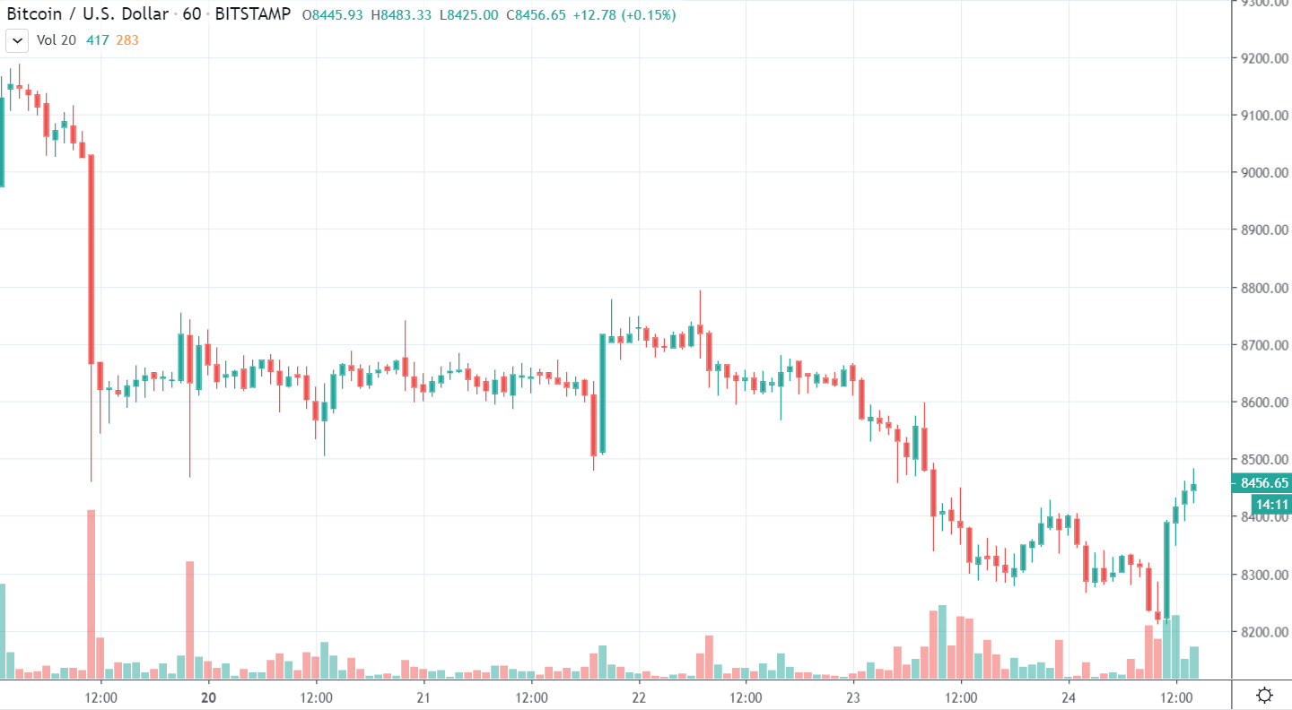 Bitcoin poslúchol Jakuba a po štvrtkovom LIVE Tradingu (ktorý seká pretože YouTube má problém so streamovaním) sa vydal na ďalší pokles. Dnes okolo obeda tak konečne otestoval support na hladine 8200 $. Na dosiahnute tejto ceny býci silno zareagovali a teraz už niekoľko hodín stúpame.