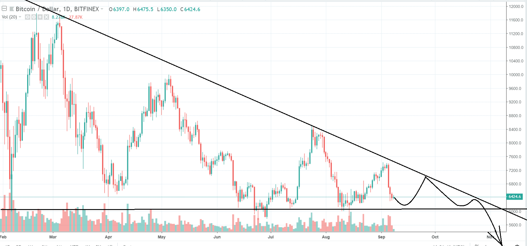Z hľadiska technickej analýzy je pokles pod 6000 $ viac než možný. Bitcoin je momentálne uzatvorený v trojuholníku s dnom na 6k a klesajúcim stropom. Viď graf: