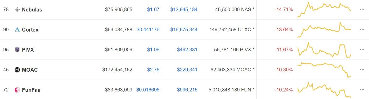 Medzi najstratovejšími altcoinami sa objavili hneď dvaja včerajší rekordmani. PIVX spravil otočku o 180 stupňov a po včerajšej 11% pumpe predviedol 11% dump. Retracement Cortexu zatiaľ došiel do polovice. Zajtra pravdepodobne príde o druhú polovicu svojich ziskov.