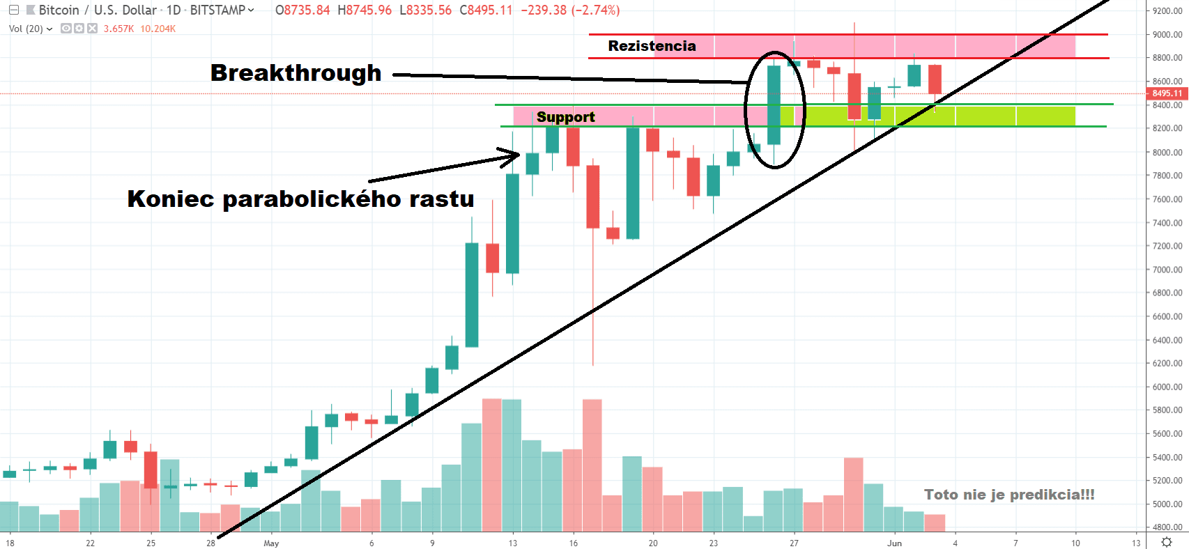 Ešte tu však máme strednedobú trendline, podľa ktorej Bitcoin pokračuje prakticky od začiatku mája. Momentálne trh túto trendline testuje a je možné, že už dnešná daily svieca rozhodne o tom, či budeme v najbližších týždňoch ďalej stúpať a otestujeme 10 000 $, alebo sa dočkáme prvej väčšej tohtoročnej korekcie.