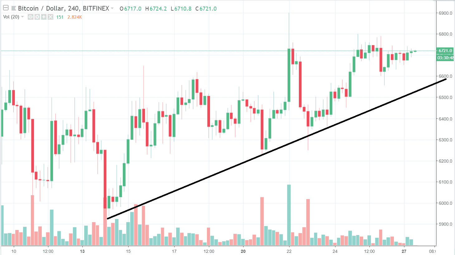 Už dva týždne pokračuje pozvoľný rast Bitcoinu a na grafe sa nám začína tvoriť daily uptrend. Trendová línia začína na lokálnom minime zo 14. augusta a Bitcoin zatiaľ ostáva nad ňou. Tento krehký downtrend však nič neznamená. Veľkí hráči sú z veľkej časti mimo trhu a hodnota BTC je ovplyvňovaná retailom. Záujem oň stúpa => cena sa zvyšuje, ale to sa môže veľmi rýchlo zmeniť.