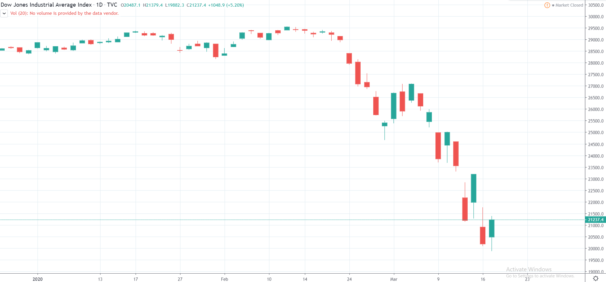 Akciové trhy po včerajšom krváku zaznamenali menší retracement. Index Dow Jones Industrial Average, ktorý trackuje americkú ekonomiku, dnes síce dosiahol nové low – 19 900 bodov – no následne začal rásť a aktuálne už je na viac než