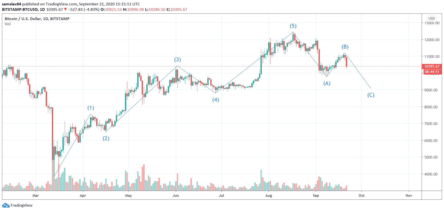 Trh s kryptomenami od obeda začal výraznejšie klesať. Bitcoinu sa nepodarilo uzavrieť weekly sviecu nad kľúčovou hladinou 11 200 $. Ostáva tak pod stúpajúcou trendline a septembrová ABC korekcia pokračuje.