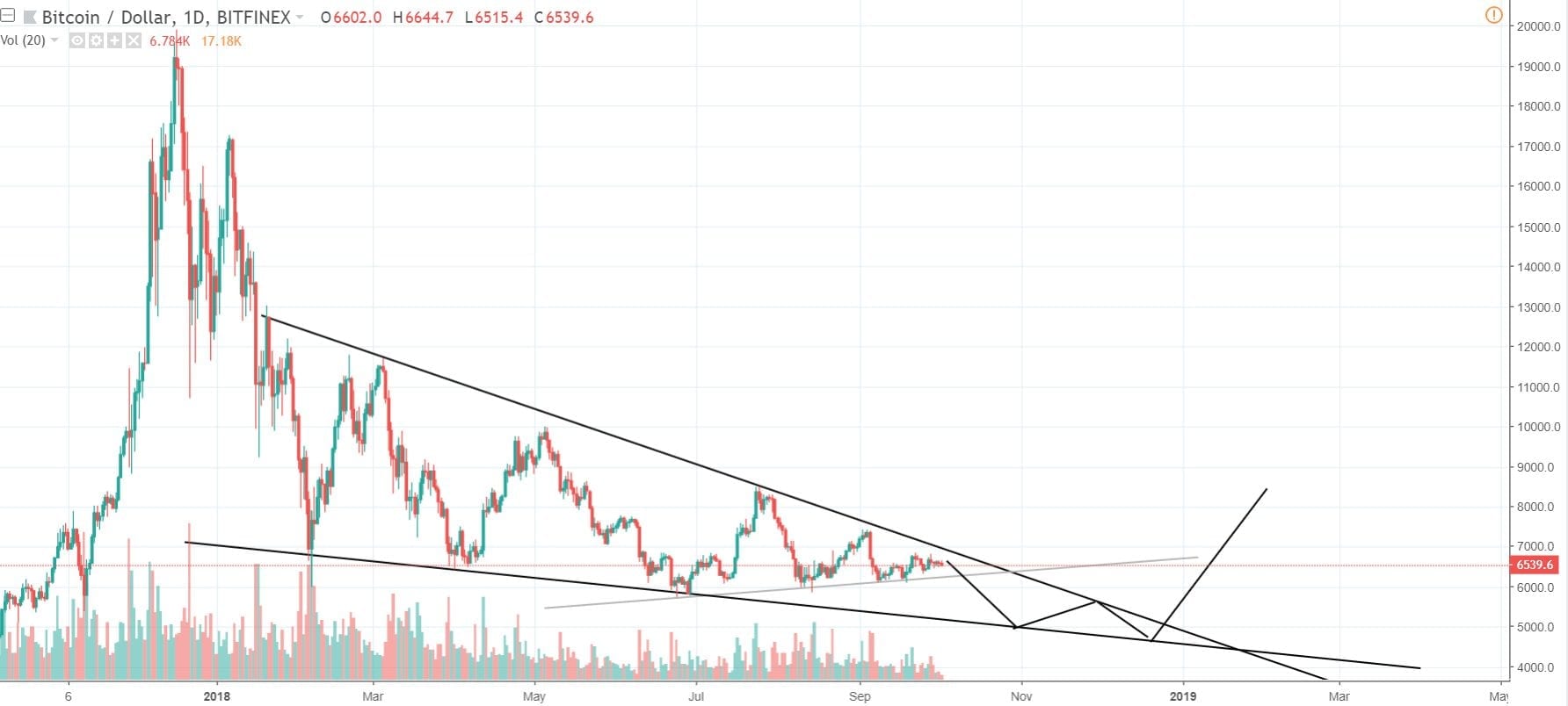 Dočkať by sme sa mali finálneho otestovania hranice 5000 $ a potom snáď aj následný návrat späť na 6500 $ – prerazenie trendline. Bohužiaľ, toto prerazenie sa môže stať o niečo neskôr, než by sme chceli.