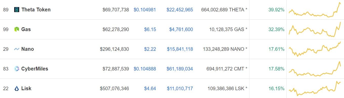 TRON svojich investorov potešil 7-percentnými ziskmi. Zdá sa, že tá hromada pozitívneho fundamentu sa konečne začína vyplácať. Lisk zaznamenal 16% pumpu, 0x (coin, ktorý možno pôjde na Coinbase) posilnil o 8% a Nano si dnes užíva 17,5% bull run!