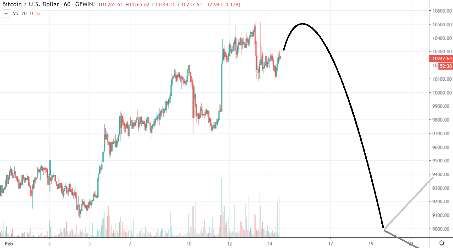 Je možné, že sa Bitcoin otočí už tento víkend? Dosiahne ešte raz 10 500 dolárov a vydá sa dole? Na hodinovom grafe by tak vykreslil pekný dvojitý vrchol. Samozrejme, ide iba o špekulácie, ale mali by sme si dať na túto možnosť.