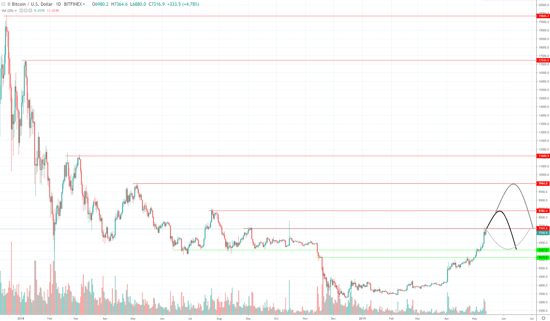 Ďalšie rezistencie sú tvorené lokálnymi high z minulého roka a celkovým ATH z decembra 2017. Viď graf: