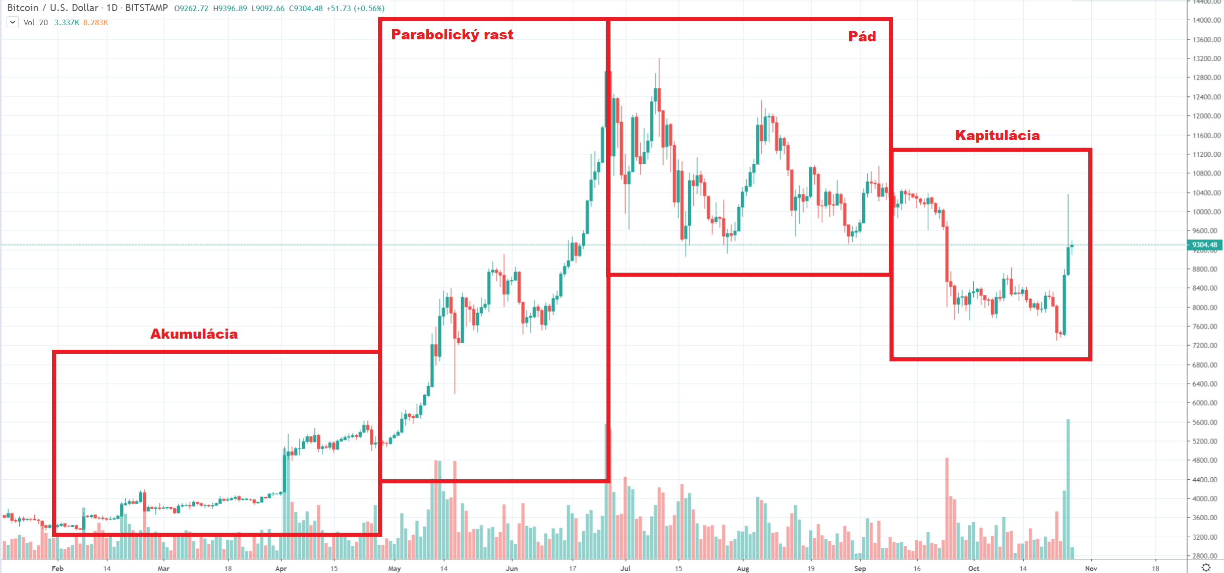 V posledných deviatich mesiacoch sme si tak trochu zopakovali to, čím si kryptomeny prešli v rokoch 2017-2018. Bitcoin od začiatku roka postupne prešiel všetkými fázami bubliny. I keď, tentokrát bola jeho štartovacia pozícia 3200$ a high dosiahol na hladine 14 000 $. V lete potom nasledoval bear market a po spustení prišla kapitulačná sviečka (pád z 10 000 $ na 8000 $).