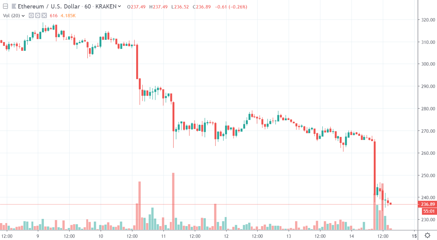 Ethereum dnes zažíva veľmi nepríjemný deň. Prepadlo sa viac, než akýkoľvek iný high-cap altcoin, snáď s výnimkou BSV. Nie je teda v dobrej spoločnosti. Po 12% poklese nakoniec narazilo na relatívne slabý support na hladine 230 $.