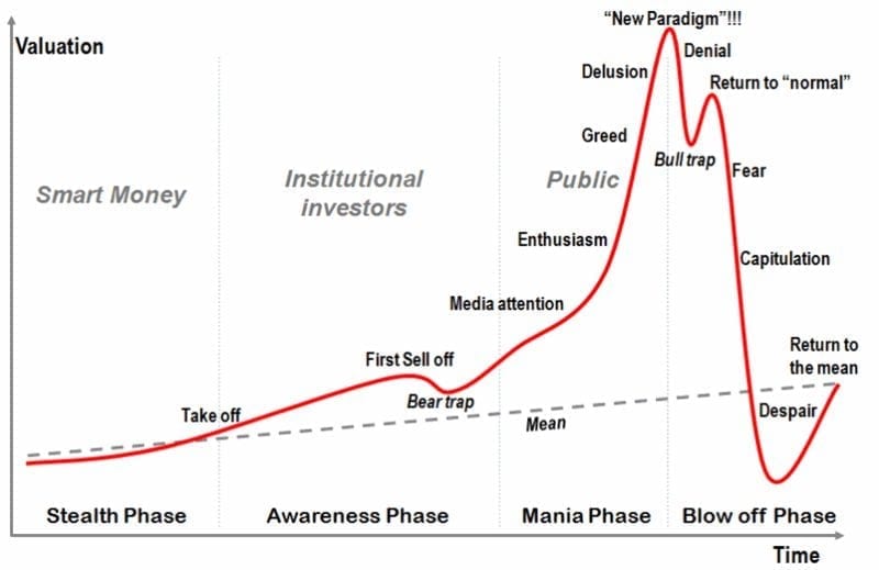 Fázy bublinyAktuálne sme už za fázou „return to normal“ a ak budeme pokračovať „podľa plánu,“ tak až teraz začne tiecť krv. Prepad sa zastaví až na supporte 6000 $ a to ešte budeme radi.