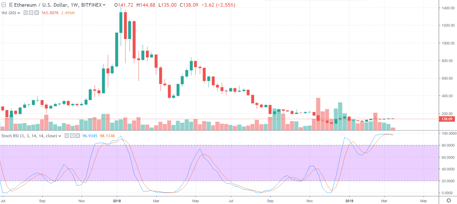 Bitcoin už tri mesiace klope na dvere tejto rezistencie, ale nikto neotvára. Pomaly, ale isto sa dostávame do bodu, kedy nám cestu pretne aj dlhodobá klesajúca trendline. Bitcoin zase klesol pod 4 000 $, Stochastic RSI už na weekly grafe preťalo RSI a všetko nasvedčuje tomu, že Bitcoin čaká ďalší prepad. Veľa obchodníkov tvrdí, že až na 2 500 $.