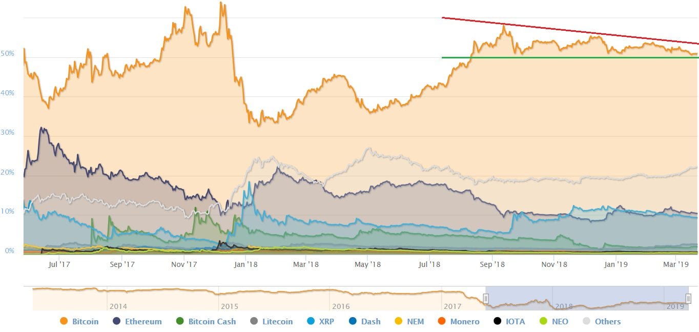 Pri pohľade na graf dominancie sa na prvý pohľad nič zaujímavé nedeje. Bitcoin stále ovláda viac než 50 % trhu, Ethereum sa drží na desiatich percentách a tesne v pätách má XRP.
