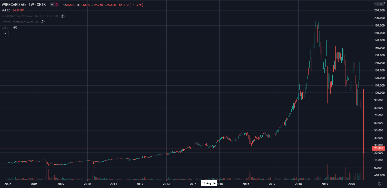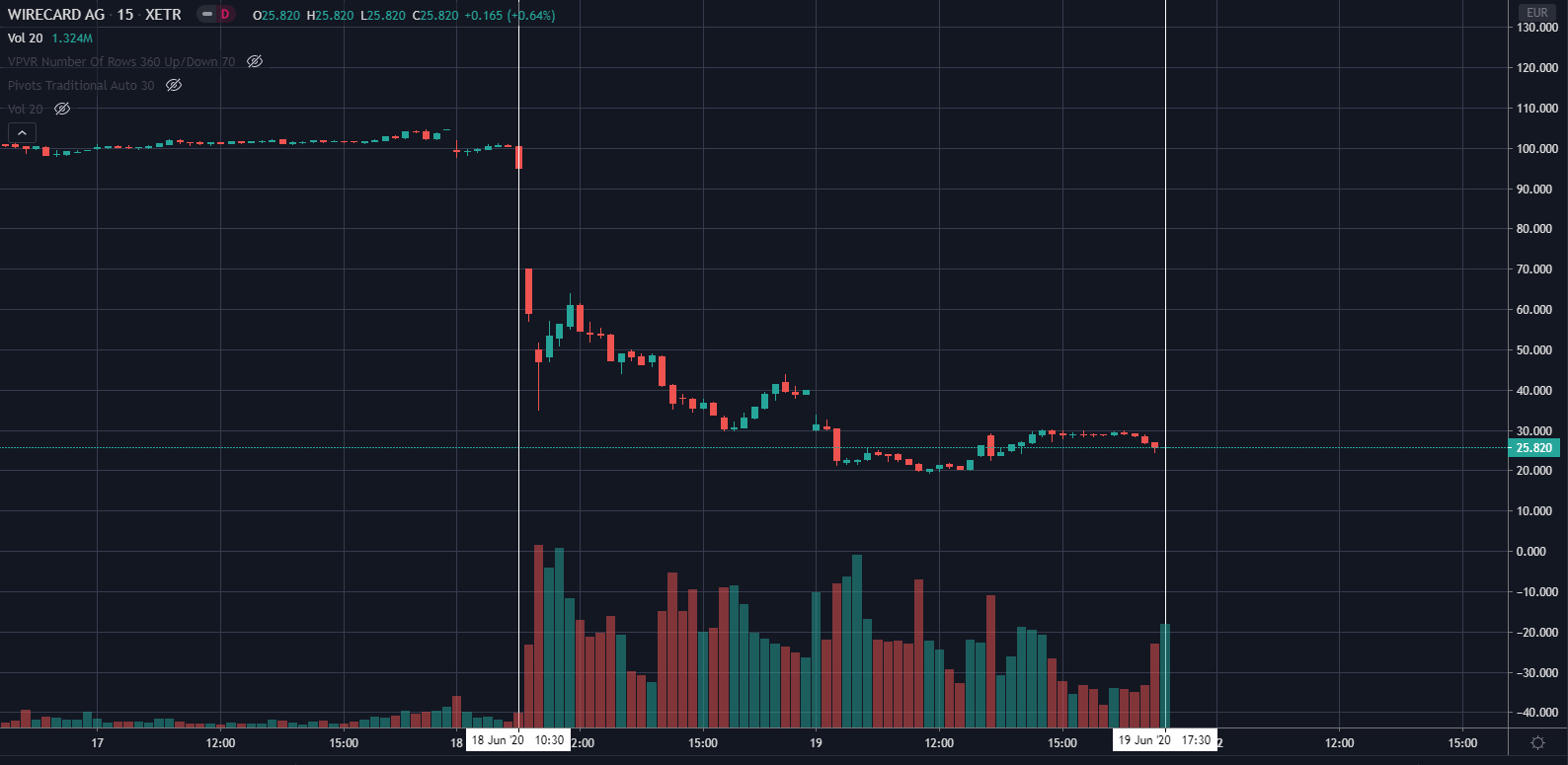 Akcie Wirecard, nemeckého poskytovateľa platieb, zažili 18. júna prepad o viac než 60 %. Všetko to spôsobila správa, že auditori nemohli nájsť 1,9 miliardy eur, ktoré sa mali nachádzať na účtoch. Tým teda nastalo znovu odloženie zverejnenia finančnej správy za rok 2019. Odklad je už štvrtý v poradí.